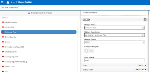 From the Existing Widgets by Groups accordion menu, select the widget that you want to edit. A widget builder stages panel opens.