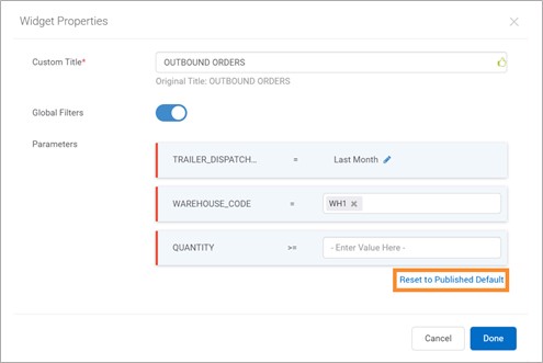 As a dashboard publisher or subscriber, you can now reset a widget’s parameters on a published dashboard to the latest published version. A new Reset to Published Default button has been added to the Widget Properties form of published dashboards with enforced versioning and filter changes allowed.