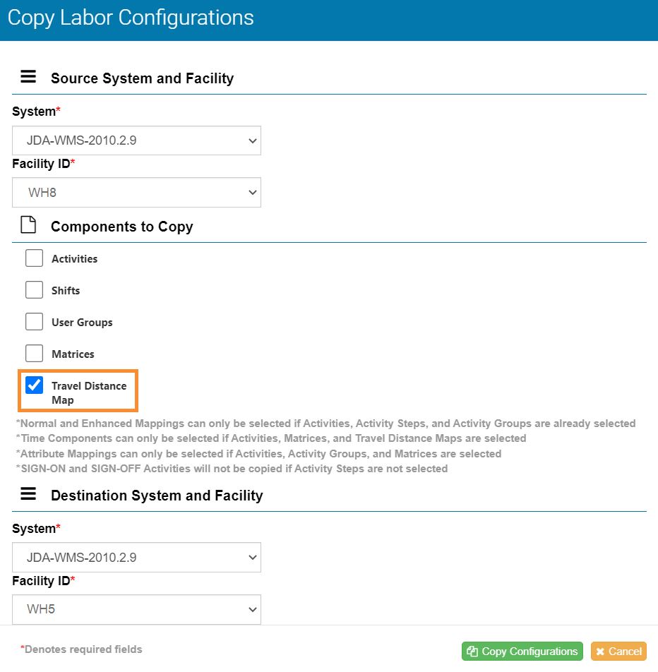 As part of Copying Labor Configurations of a warehouse to another, you can now copy Travel Distance Map s.