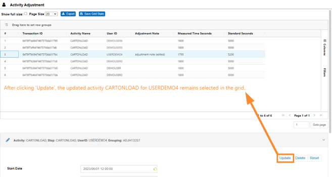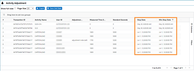 The Min Stop Date is now displayed in the Facility’s time zone and is shown by default in the Activity Adjustment Admin screen. Previously, Min Stop Date was displayed in Coordinated Universal Time (UTC). In the example below, just like the Stop Date, the Min Stop Date is displayed in the Facility’s time zone: