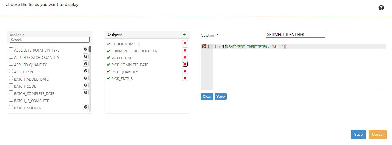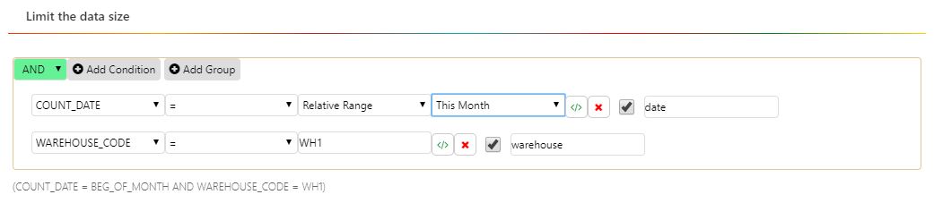In the screenshot above, the filter criteria are set to select all records that have a count date within this month and where the warehouse code is ‘WH1’. The last condition is set up as a constant, which means that users won’t be able to change it in the widget on the dashboard.