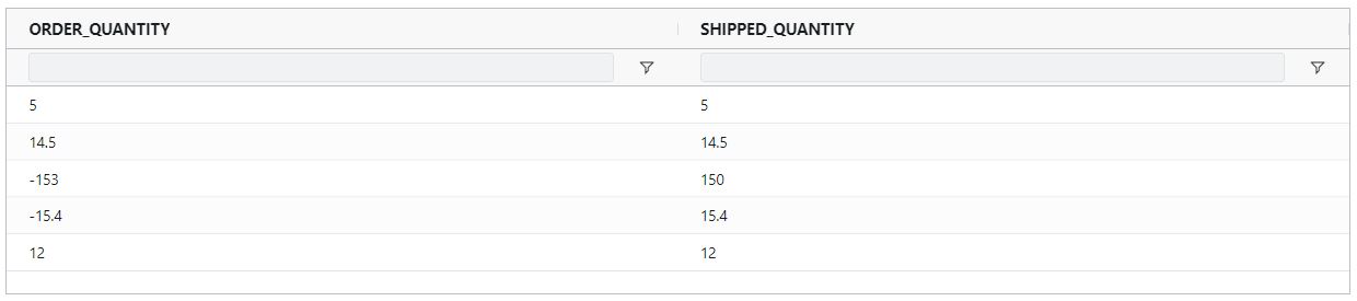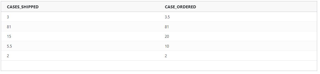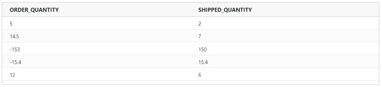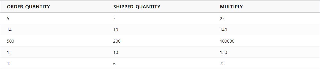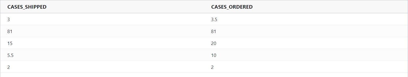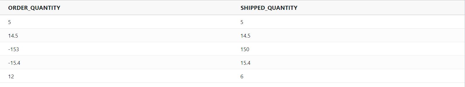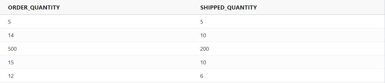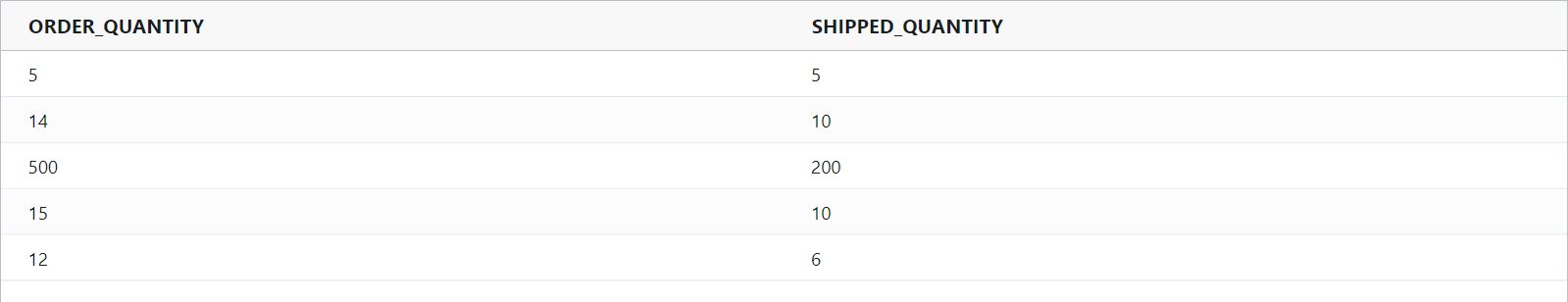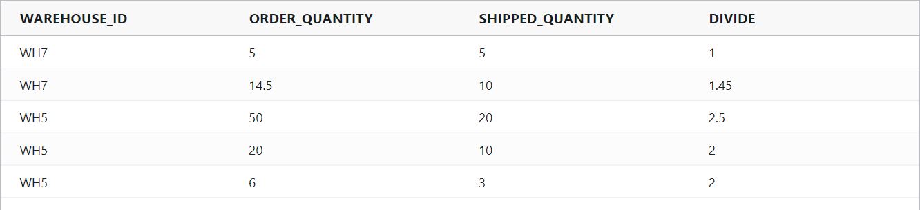 divide(ORDER_QUANTITY, SHIPPED_QUANTITY)Example Input