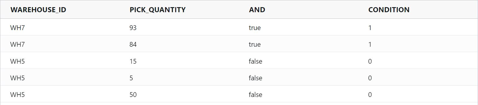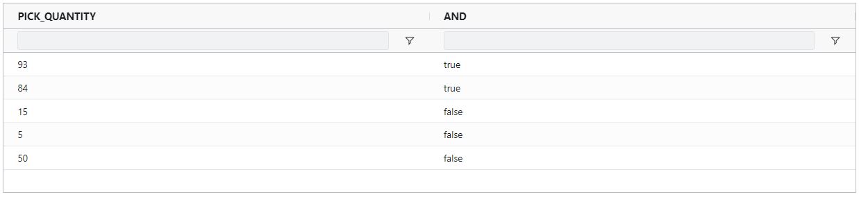 To aggregate the true/false results, embed the and function inside the condition function and wrap the condition function inside the desired aggregation function. In the example, the condition function returns a value of 1 if the PICK_QUANTITY value is greater than 50 and less than 100; otherwise, it returns a value of 0. The expression then sums the records that meet the specified condition.