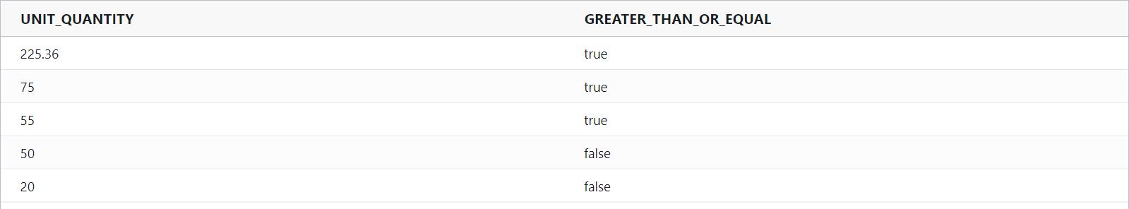 greaterThanOrEqual : Compares two values and returns ‘true’ when the first value is greater than or equal to the second value. Otherwise it returns false.