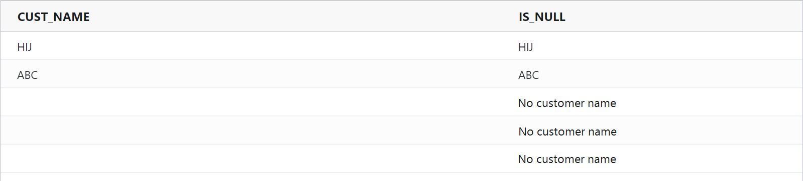 If the expression evaluates to a null value, including instances of undefined values or missing fields, returns the value of the replacement expression. In the example, the isNull function returns the value “No customer name” if CUST_NAME of a record stores a null value. The condition function returns a value of 1 if the record has a value equal to “No customer name”; otherwise, it returns a value of 0. The expression them sums the number of records that meet the specified condition.