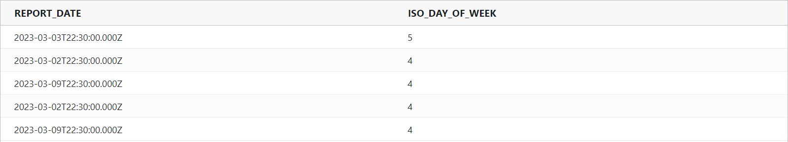 isoDayOfWeek : Returns the weekday number in ISO 8601 format, ranging from 1 (for Monday) to 7 (for Sunday).
