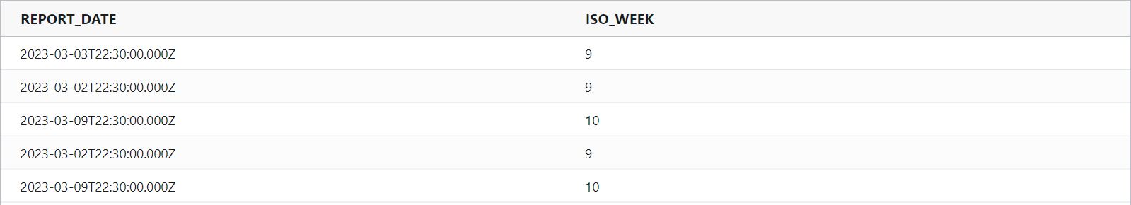 isoWeek : Returns the week number in ISO 8601 format, ranging from 1 to 53.