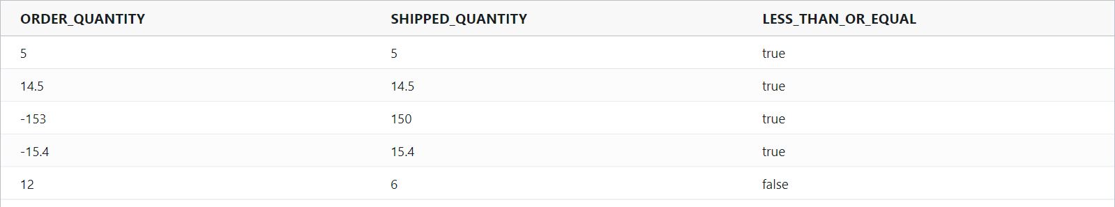 lessThanOrEqual : Compares two values and returns ‘true’ when the first value is less than or equal to the second value. Otherwise it returns false.