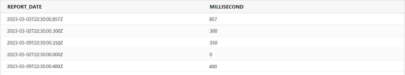 millisecond : Returns the millisecond portion of a date as an integer between 0 and 999.