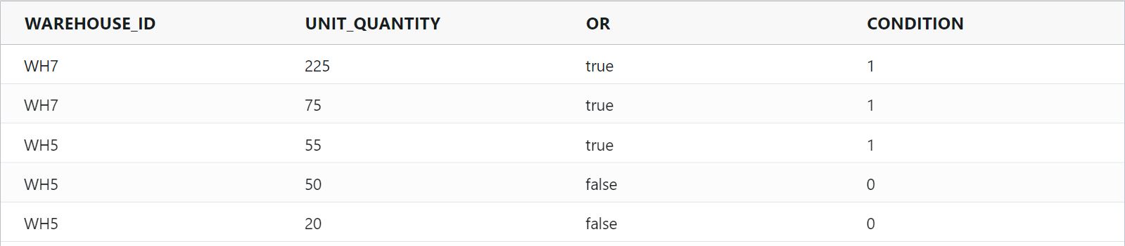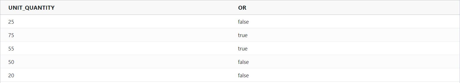 To aggregate the true/false results, embed the or function inside the condition function and wrap the condition function inside the desired aggregation function. In the example, the condition function returns a value of 1 if the PICK_QUANTITY value is greater than 50 or less than 20; otherwise, it returns a value of 0. The expression then sums the records that meet the specified condition.