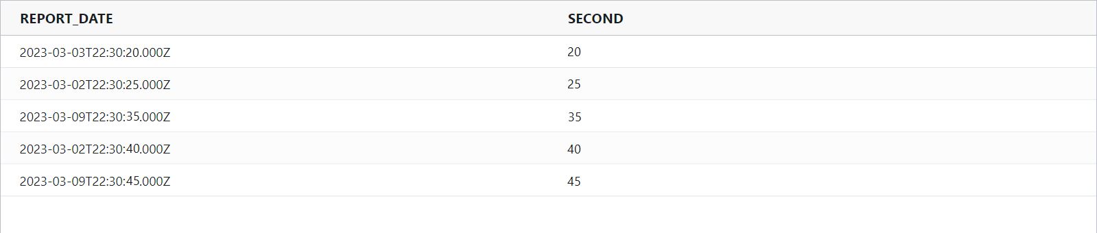 second : Returns the second portion of a date as a number between 0 and 59, but can be 60 to account for leap seconds.
