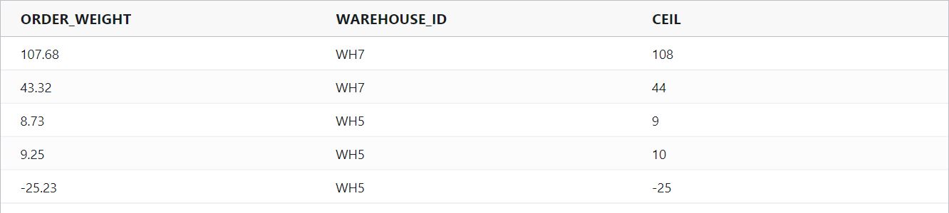 ceil : Returns the smallest integer greater than or equal to the specified number.
