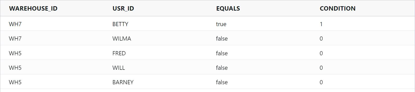 To aggregate the true/false results, embed the equals function inside the condition function and wrap the condition function inside the desired aggregation function. In the example, the condition function returns a value of 1 if USR_ID equals “BETTY”; otherwise, it returns a value of 0. The expression then sums the records that meet the specified condition.