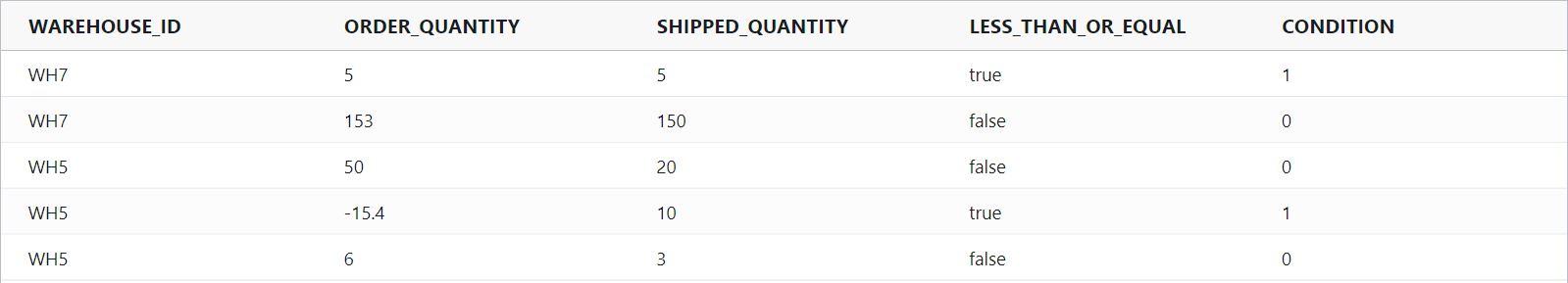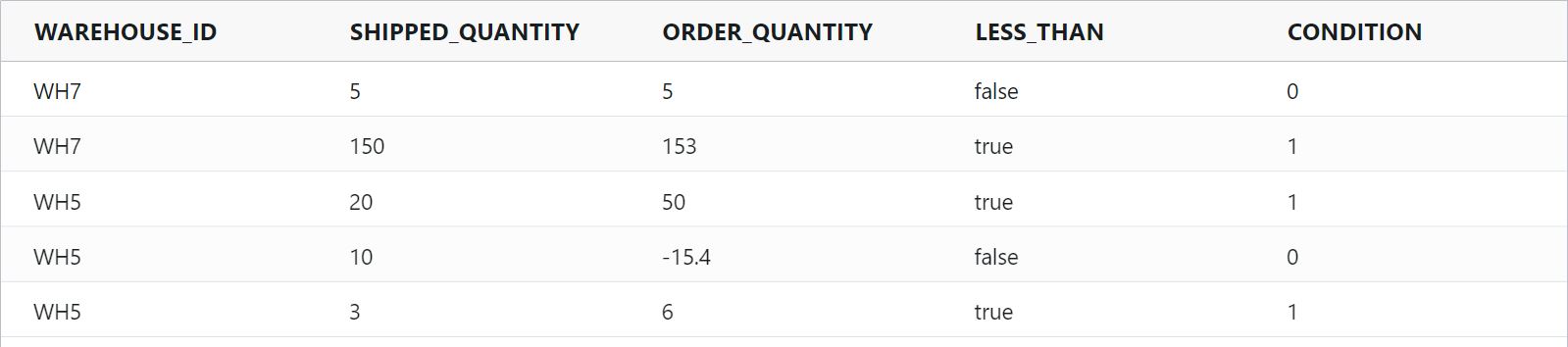 To group the true/false results, the and function must be wrapped inside the condition function, before it’s embedded in an aggregation function. To aggregate the true/false results, embed the lessThan function inside the condition function and wrap the condition function inside the desired aggregation function. In the example, the condition function returns a value of 1 if the SHIPPED_QUANTITY value is less than the ORDER_QUANTITY value; otherwise, it returns a value of 0. The expression then sums the records that meet the specifid condition.